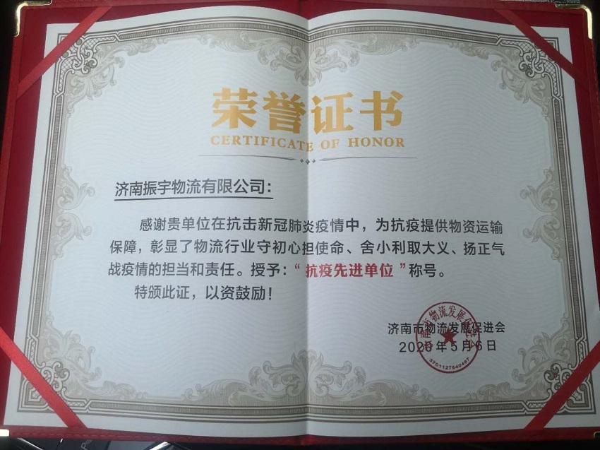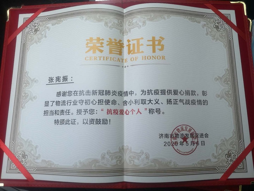 經(jīng)評選,振宇物流榮獲“抗疫先進單位”,總經(jīng)理張憲振榮獲“抗疫愛心個人”!