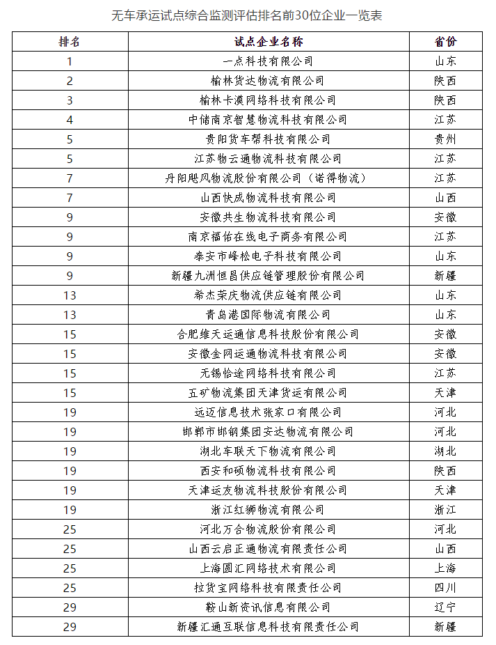 無車試點(diǎn)排名前30的,50%以上都是跟大宗運(yùn)輸相關(guān)