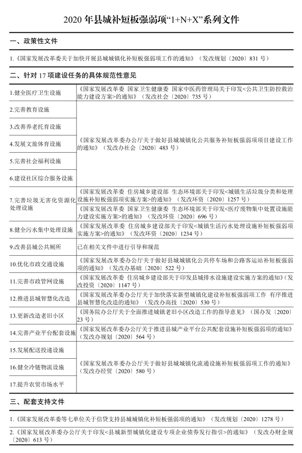2020年5月29日,國家發(fā)展改革委印發(fā)《關(guān)于加快開展縣城城鎮(zhèn)化補(bǔ)短板強(qiáng)弱項工作的通知》,聚焦縣城及縣級市城區(qū),兼顧鎮(zhèn)區(qū)常住人口10萬以上的非縣級政府駐地特大鎮(zhèn)、2015年以來“縣改區(qū)”“市改區(qū)”形成的地級及以上城市市轄區(qū),將公共服務(wù)設(shè)施、環(huán)境衛(wèi)生設(shè)施、市政公用設(shè)施、產(chǎn)業(yè)培育設(shè)施4大領(lǐng)域共17項建設(shè)任務(wù)作為建設(shè)重點,明確了總體要求、主要任務(wù)、要素保障和組織實施方式,公布了縣城城鎮(zhèn)化補(bǔ)短板強(qiáng)弱項項目范疇和縣城新型城鎮(zhèn)化建設(shè)示范地區(qū)名單。