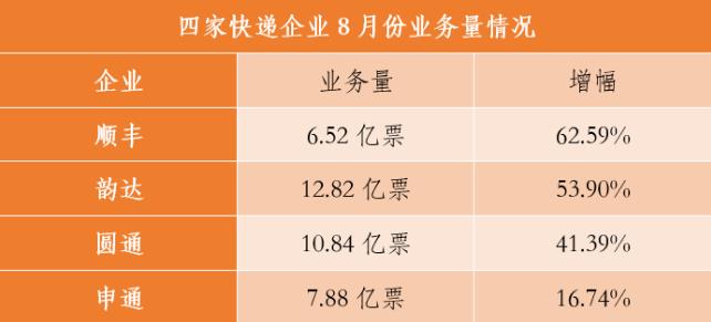 9月18日晚間,順豐控股、圓通速遞、韻達股份和申通快遞四家企業(yè)發(fā)布8月經營簡報。數(shù)據(jù)顯示,四家快遞企業(yè)繼續(xù)保持高速增長。其中,順豐業(yè)務量增幅繼續(xù)領跑,韻達連續(xù)五個月、圓通連續(xù)四個月單月業(yè)務量破10億票。
