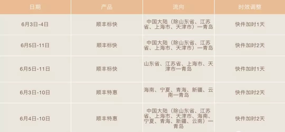 6月3日-11日,全網(wǎng)進(jìn)出青島流向的順豐次晨、即日、生鮮速配、部分醫(yī)藥冷運等對溫度及時效要求較高的產(chǎn)品和冷藏冷凍件停收,物流普運等重貨類產(chǎn)品停收(重貨快運加時不停收)。