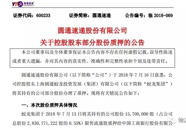 7月17日,圓通速遞發(fā)布關于控股股東部分股份質(zhì)押的公告。公告顯示,公司控股股東上海圓通蛟龍投資發(fā)展(集團)有限公司(以下簡稱“蛟龍集團”)將其持有的公司部分股份辦理了質(zhì)押。