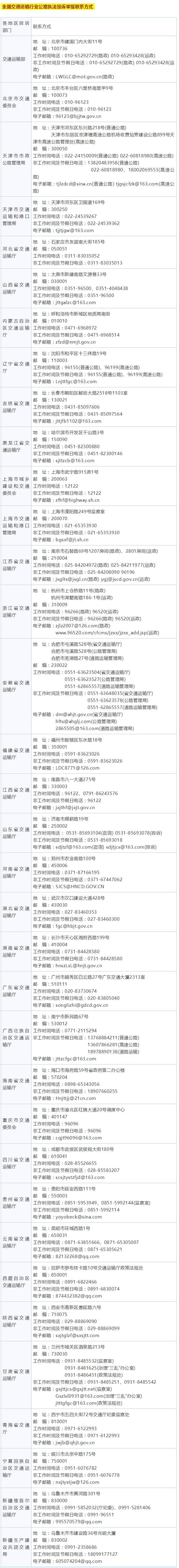交通運(yùn)輸部公路局、道路運(yùn)輸司聯(lián)合向社會(huì)集中公布全國(guó)交通運(yùn)輸行業(yè)公路執(zhí)法行風(fēng)投訴舉報(bào)電話、通信地址和電子郵箱地址。