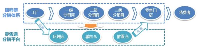 因此雙方在2018年11月達(dá)成了整體合作,康師傅將借助阿里零售通平臺(tái),推進(jìn)門店數(shù)字化、供應(yīng)鏈數(shù)字化、營(yíng)銷數(shù)字化和決策數(shù)字化等在內(nèi)的一系列升級(jí)優(yōu)化,構(gòu)建智能分銷網(wǎng)絡(luò),為傳統(tǒng)線下銷售渠道接入“中央處理器”。具體做法是康師傅將組織全國(guó)分銷網(wǎng)絡(luò)的客戶加入零售通平臺(tái),分銷商向工廠下單、夫妻老婆店向分銷商下單均使用零售通的線上電商平臺(tái),貨物視情況入到菜鳥系的倉(cāng)庫(kù),收到訂單后借助區(qū)域倉(cāng)、城市倉(cāng)、前置倉(cāng)等不同類型的倉(cāng)庫(kù),以較短時(shí)效送達(dá)門店店主手里??祹煾档纳塘鳌⑿畔⒘?、物流、資金流在阿里零售通體系中流轉(zhuǎn),物流鏈路變短,中轉(zhuǎn)裝卸次數(shù)變少,周轉(zhuǎn)效率更高。